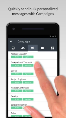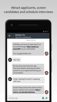 • Send texts to announce job openings and screen candidates • Remind candidates of interviews, start dates, and onboarding paperwork • Get notified when candidates respond or ask questions • Reply to candidates and view messaging history • Find any candidate in your system • Analyze and track the performance of your text campaigns